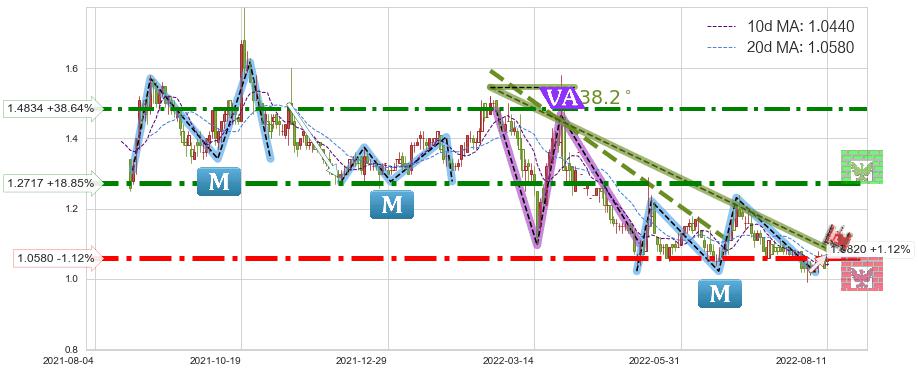 ♘ 支撑价格位1.0580,可信任强度90.66%,距离最后交易2022-08-12形成的收盘价格1.0700相差 -1.12%