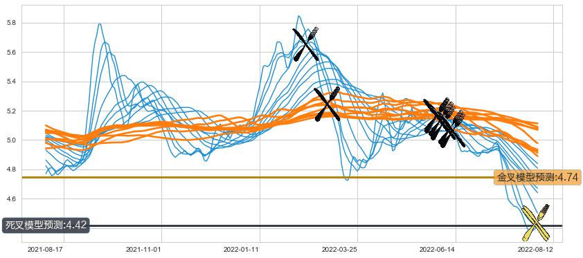 ➣ 40小时均线于(2022-06-01: 5.14)形成【死叉】基于【死叉历史模型】预测死叉后最低波谷价格: 4.50, 死叉后最低价格4.36,已经下跌超出预测最低波谷价格, 预期反弹