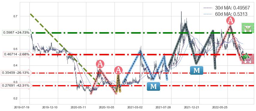 ♘ 支撑价格位0.35459,可信任强度60.29%,距离最后交易2022-08-12形成的收盘价格0.48000相差 -26.13%