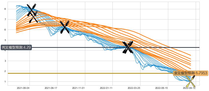 ➣ 34小时均线于(2022-02-23: 4.30)形成【死叉】基于【死叉历史模型】预测死叉后最低波谷价格: 3.663, 死叉后最低价格0.9500,已经下跌超出预测最低波谷价格, 预期反弹