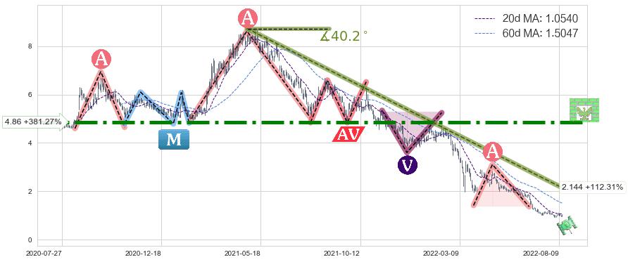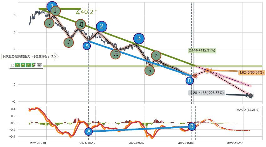 ♘ 在最后的下跌阶段2021-04-28至2022-08-12,存在 持续未破位的阻力位 ,阻力价格2.144,可信任强度79.86%,其距离最后价格1.0100相差 +112.31%