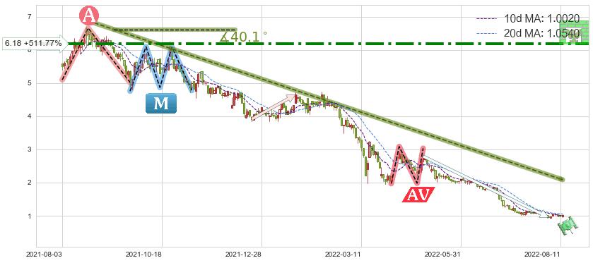从2022-05-03至2022-08-12,共包含71个交易日,阶段股价下跌-95.47%,阶段股价变动位移路程比: 1 : 2
