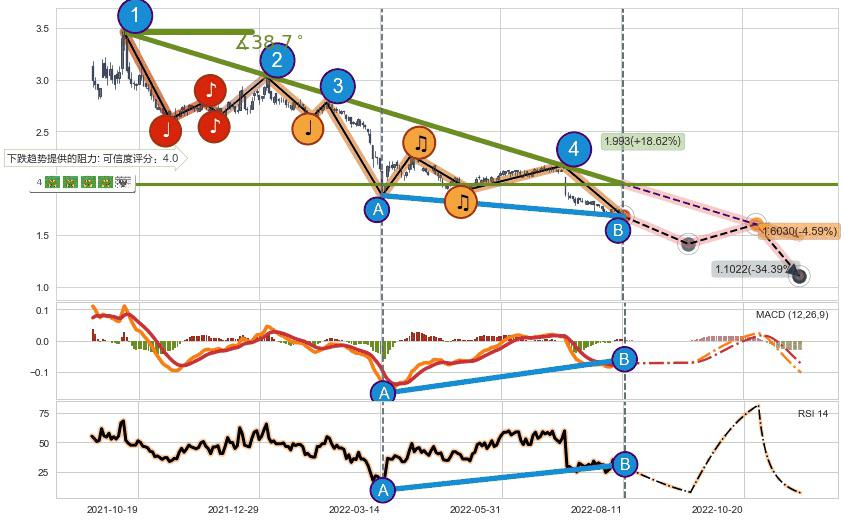 ♘ 在最后的下跌阶段2021-10-07至2022-08-12,存在 持续未破位的阻力位 ,阻力价格1.993,可信任强度82.45%,其距离最后价格1.6800相差 +18.62%