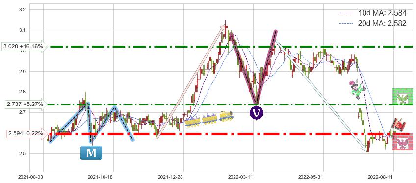 ♘ 阻力价格位3.020,可信任强度71.98%,距离最后交易2022-08-12形成的收盘价格2.600相差 +16.16%