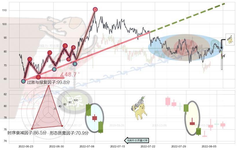 ♘ 阻力价格位91.37,可信任强度87.68%,距离最后交易2022-08-12形成的收盘价格77.85相差 +17.37%