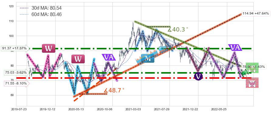 ♘ 阻力价格位75.03,可信任强度90.58%,距离最后交易2022-08-12形成的收盘价格77.85相差 -3.62%