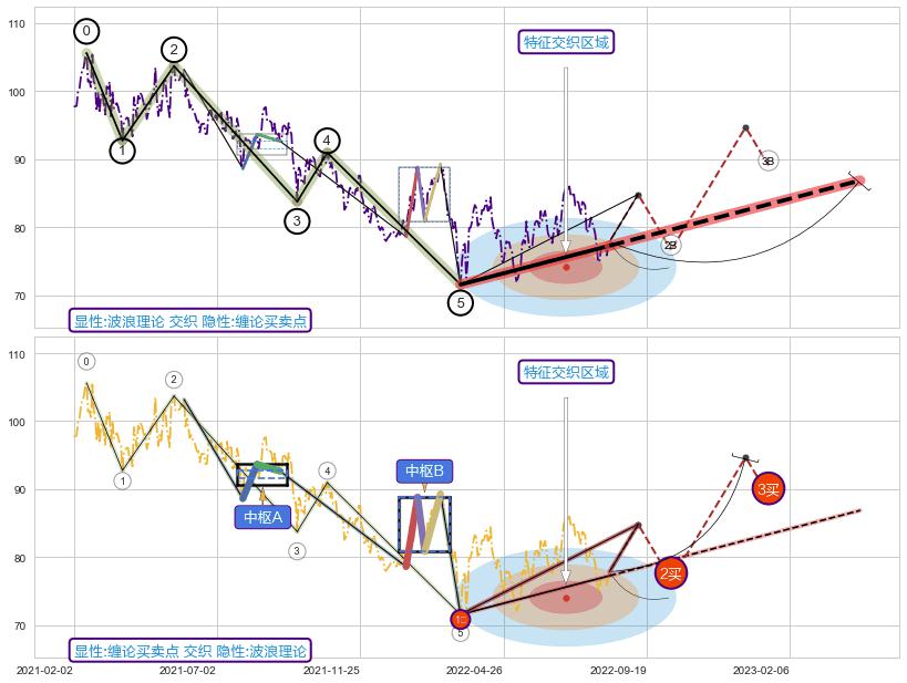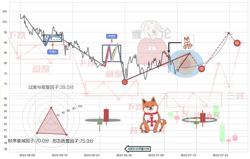 ➣ 【中枢B】:2022-01-11-2022-02-17,中枢由4笔构成,共25交易日, ZG=88.80, ZD=80.85