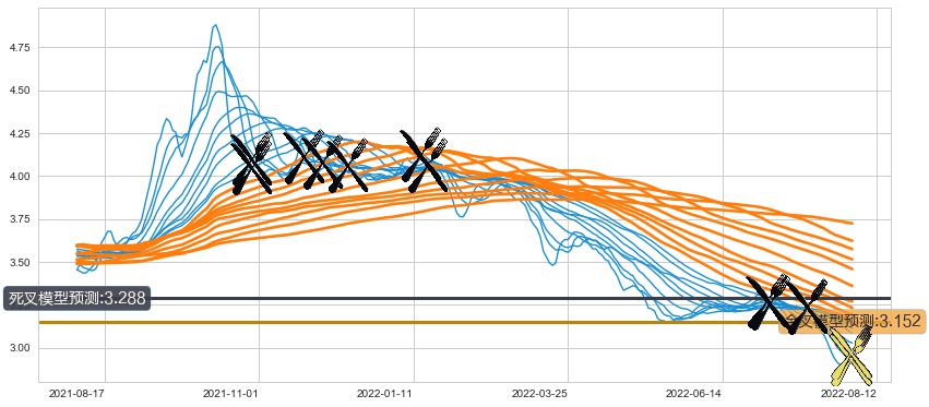 ➣ 40小时均线于(2022-07-22: 3.233)形成【死叉】基于【死叉历史模型】预测死叉后最低波谷价格: 2.992, 死叉后最低价格2.880,已经下跌超出预测最低波谷价格, 预期反弹