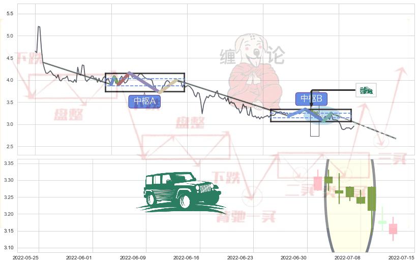 ➢ 【中枢B】:2022-06-13-2022-07-22,中枢由4笔构成,共29交易日, ZG=3.250, ZD=3.190