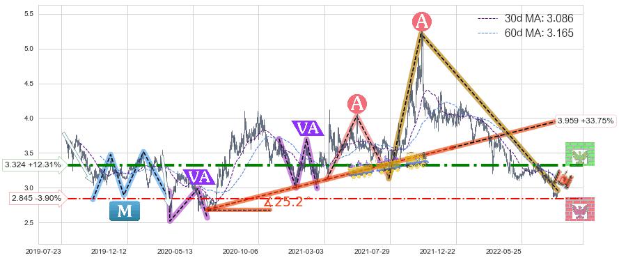 ♞ 30日均线:3.086,60日均线:3.165→ 快线<慢线