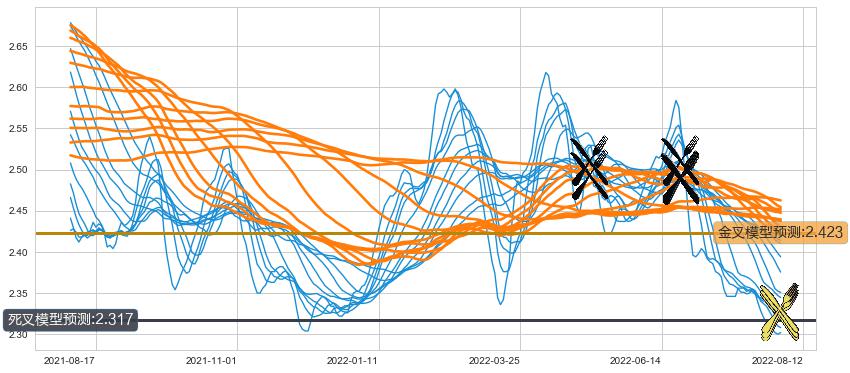 ➣ 34小时均线于(2022-06-22: 2.491)形成【死叉】基于【死叉历史模型】预测死叉后最低波谷价格: 2.316, 死叉后最低价格2.280,已经下跌超出预测最低波谷价格, 预期反弹