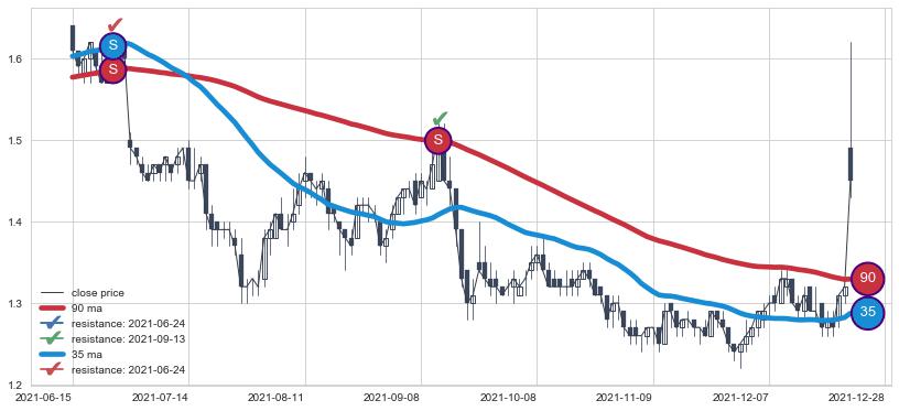 ➢ 最优均线组合共正确确认支撑阻力信号6处,正确确认率 75.00%