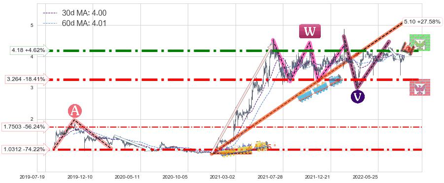 ♘ 阻力价格位4.18,可信任强度94.04%,距离最后交易2022-08-12形成的收盘价格4.00相差 +4.62%