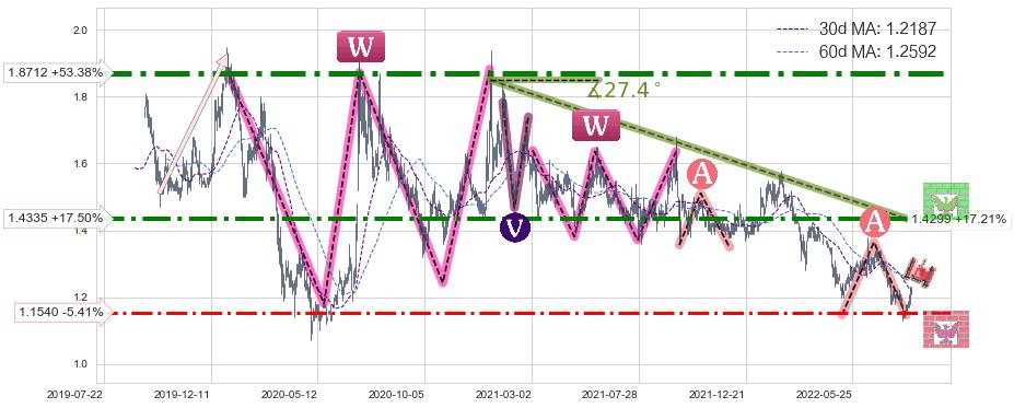 ♘ 阻力价格位1.4335,可信任强度82.79%,距离最后交易2022-08-12形成的收盘价格1.2200相差 +17.50%
