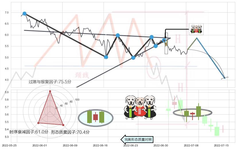 ➣ 【多空双方观望→争持→促使价格波动日益狭窄→空方打破攻守平衡点】对称三角形中继整理, 已在2022-07-05突破【支撑】颈线 5.72 →演变成下降通道