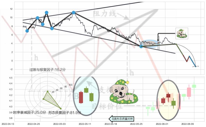 从2021-06-08至2022-04-21,共包含213个交易日,阶段股价下跌-81.34%,阶段股价变动位移路程比: 1 : 7,下跌趋势角度: 43.6