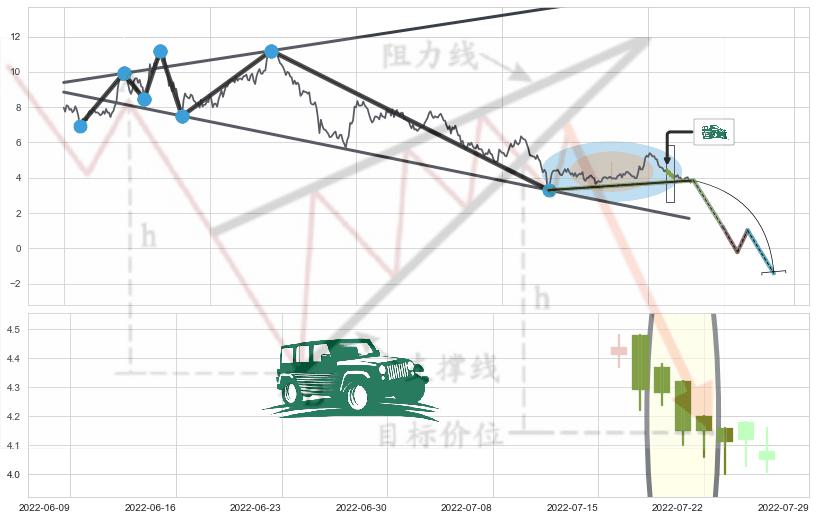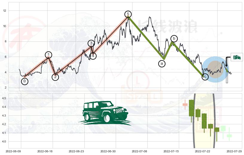 ➣ 波浪理论:猜想击穿破位c点后继续下跌 → 下跌 → 风险信号 → 小趋势跟踪