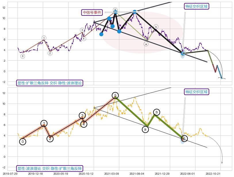 ➣ 扩散三角反转:猜想临近关键支撑位突破点 → 临近拐点下跌 → 风险信号 → 大趋势均值回复