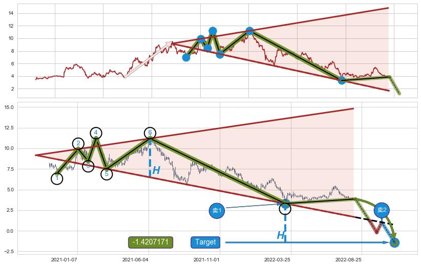 ➢ 最小反转跌幅→𝐇: 4.72 (逐步抬高阻力斜边最后的阻力点⑥与支撑边垂直距离)