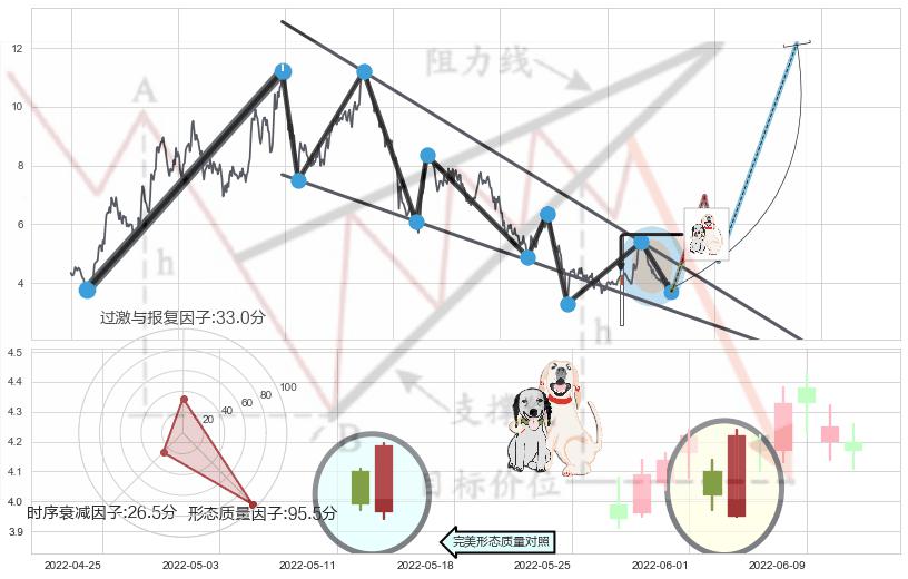 ➣ 早晨之星(黎明之星) + 降楔型临近阻力猜想转换支撑上涨信号叠加后【目标达成率】中等,【看多】信号叠加【存续影响中等】