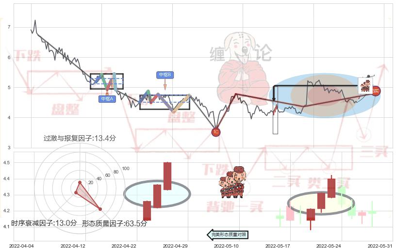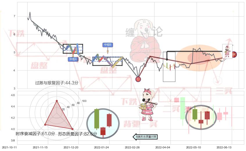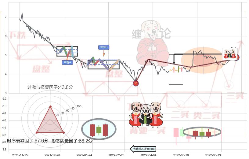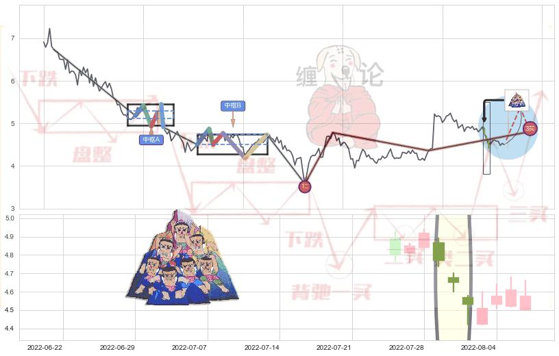 ➣ 【中枢B】:2021-12-23-2022-02-16,中枢由6笔构成,共36交易日, ZG=4.74, ZD=4.50