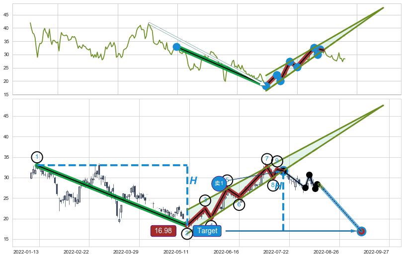 ➢ 最小中继整理跌幅→𝐇: 14.67 (𝐇楔型旗杆的长度:楔型起点→顶点)