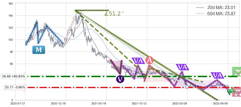 从2021-10-22至2022-05-12,共包含134个交易日,阶段股价下跌-80.66%,阶段股价变动位移路程比: 1 : 5,下跌趋势角度: 44.3