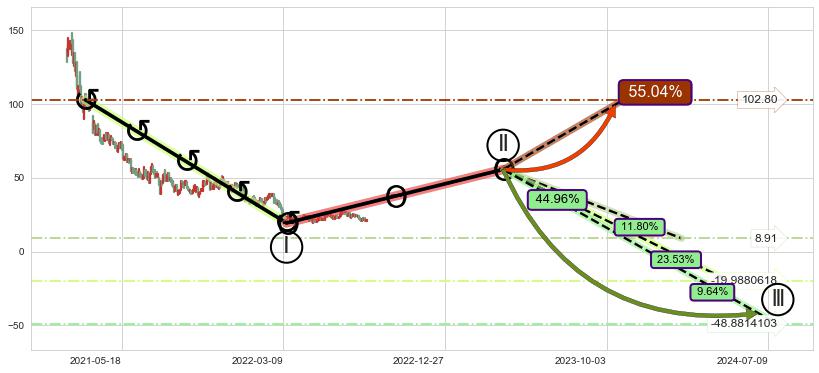 ➢ 循环浪继续向下【最低】位置(2024-07-24, -48.8814103),匹配聚类样本比例21.43%, 可能性概率9.64%
