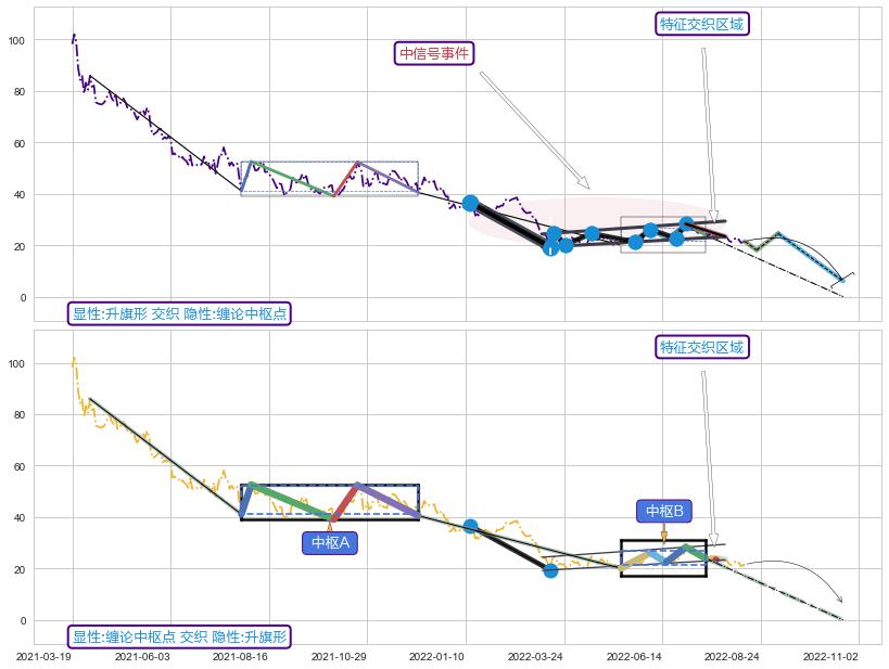 ➣ 缠论中枢点:猜想破位中枢B后持续下拉 → 下跌 → 破位中枢B支撑 → 持续趋势跟踪