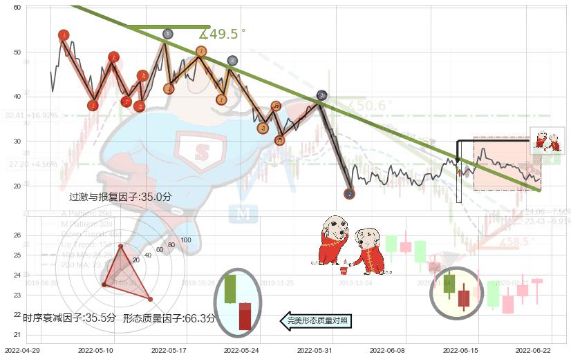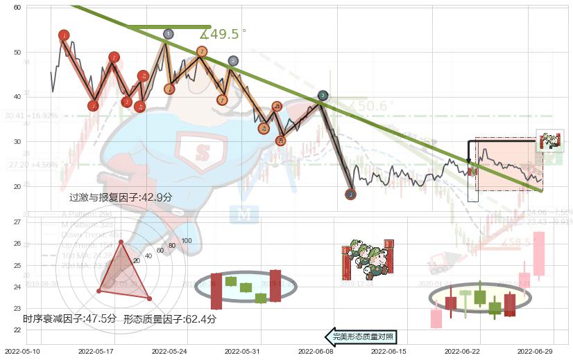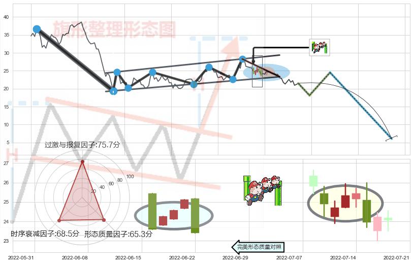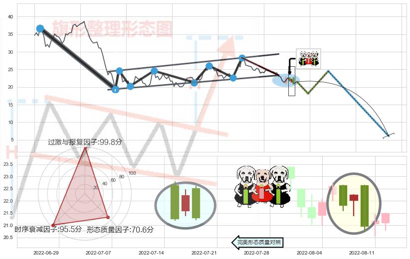➢ 下降三部曲(降势三鹤) 🔜 升旗形支撑破位转换阻力下跌 综合量化分数:37.47 【偏空】