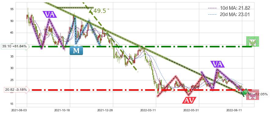 ♘ 阻力价格位39.10,可信任强度92.24%,距离最后交易2022-08-12形成的收盘价格21.50相差 +81.84%