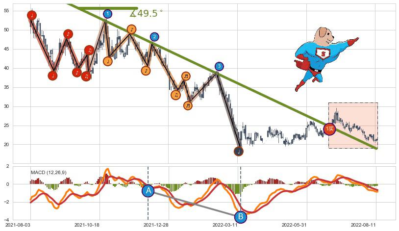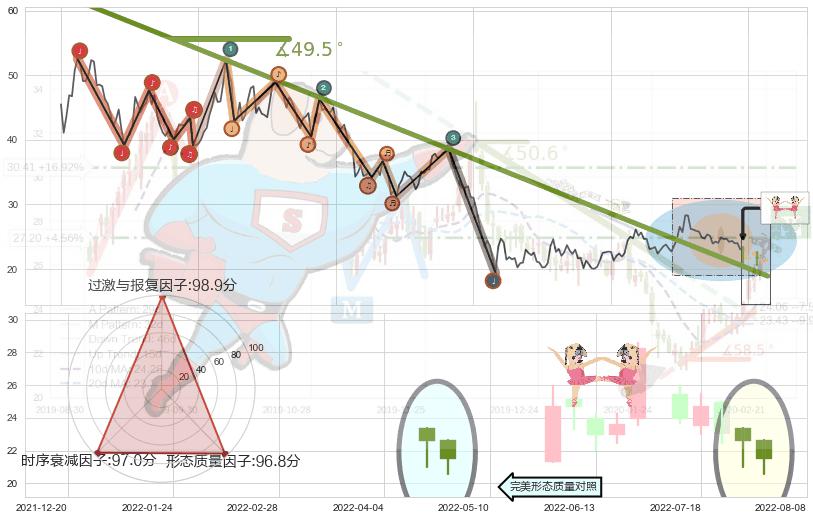 从2021-08-03至2022-03-29,共包含163个交易日,阶段股价下跌-75.61%,阶段股价变动位移路程比: 1 : 7,下跌趋势角度: 49.5