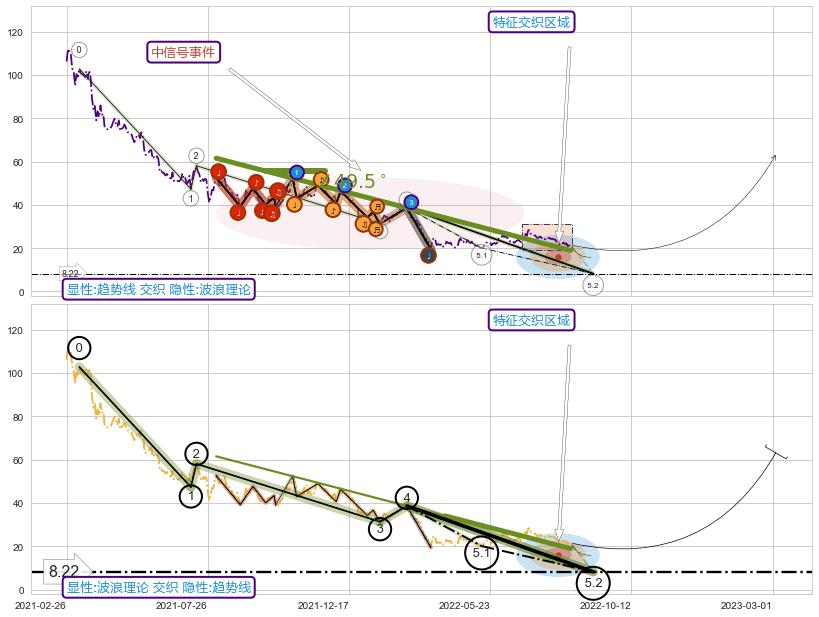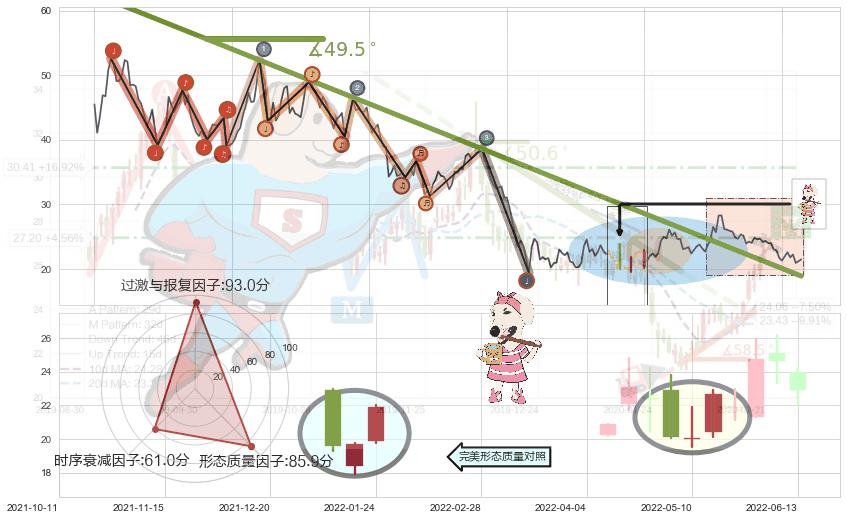从2021-10-22至2022-02-10,共包含76个交易日,阶段股价下跌-26.96%,阶段股价变动位移路程比: 1 : 8,下跌趋势角度: 69.2