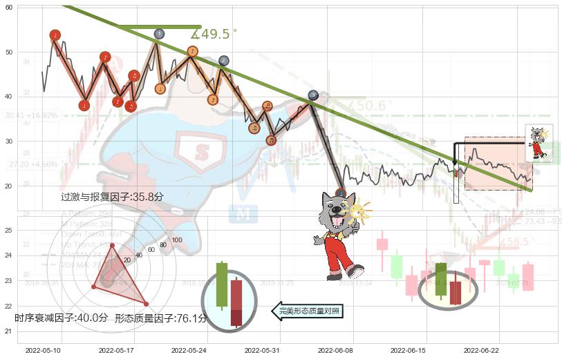 ➣ 2021-08-03-2022-03-29下跌趋势存在反转上涨[机会],虽然原下跌趋势的阻力位(18.91)已被突破,但其阻力效果尚存,原下跌趋势角度: 49.5˚