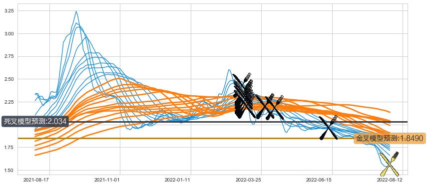 ➢ 13小时均线于(2022-06-10: 1.9592)形成【死叉】基于【死叉历史模型】预测死叉后最低波谷价格: 1.8860, 死叉后最低价格1.5200,已经下跌超出预测最低波谷价格, 预期反弹