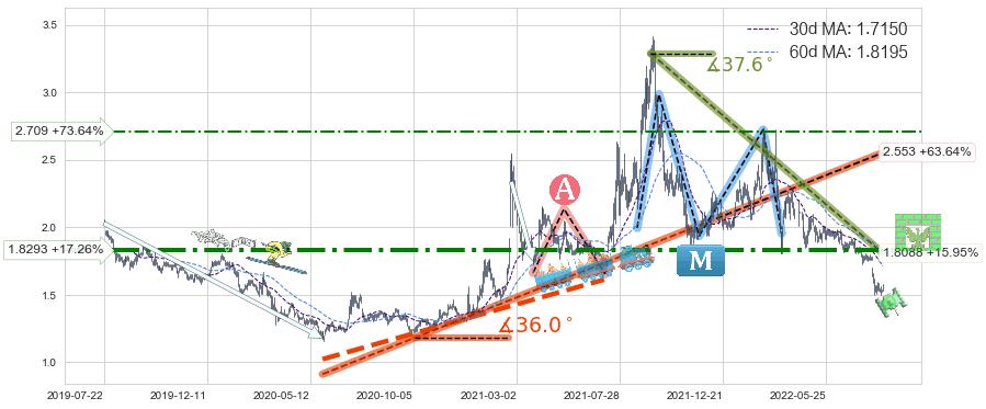 ♘ 阻力价格位1.8293,可信任强度74.92%,距离最后交易2022-08-12形成的收盘价格1.5600相差 +17.26%