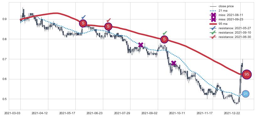 ➣ 95小时均线于(2022-05-26: 0.6886)形成【死叉】基于【死叉历史模型】预测死叉后最低波谷价格: 0.5690, 死叉后最低价格0.5000,已经下跌超出预测最低波谷价格, 预期反弹