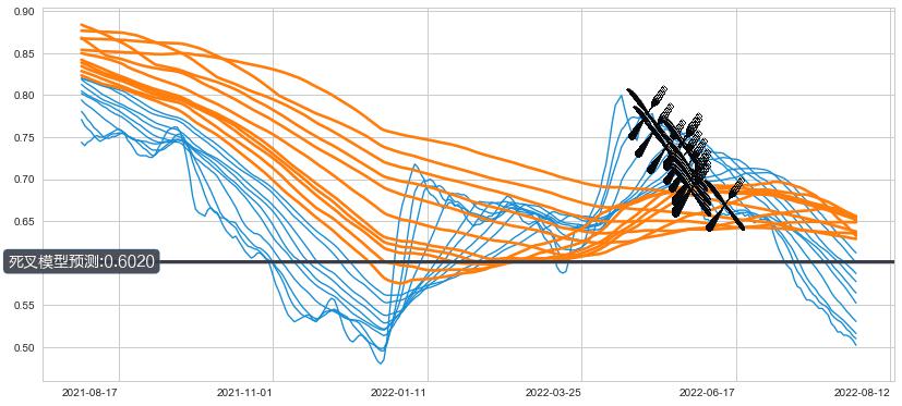 ➣ 120小时均线于(2022-06-13: 0.6685)形成【死叉】基于【死叉历史模型】预测死叉后最低波谷价格: 0.5281, 死叉后最低价格0.5000,已经下跌超出预测最低波谷价格, 预期反弹