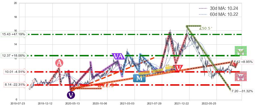 ♘ 阻力价格位15.43,可信任强度72.70%,距离最后交易2022-08-12形成的收盘价格10.48相差 +47.19%