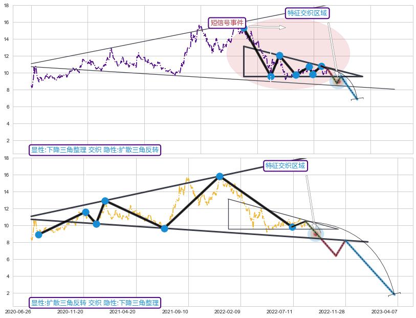 ➣ 扩散三角反转:猜想临近关键支撑位突破点 → 临近拐点下跌 → 风险信号 → 大趋势均值回复