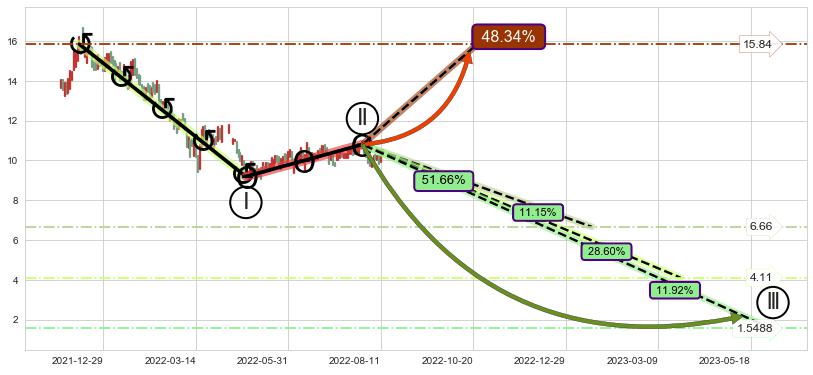 ➢ 循环浪继续向下【最高】位置(2023-01-18, 6.66),匹配聚类样本比例21.58%, 可能性概率11.15%