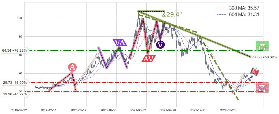 ♘ 阻力价格位64.34,可信任强度80.64%,距离最后交易2022-08-12形成的收盘价格36.50相差 +76.28%