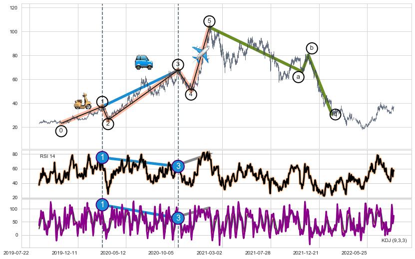 ➢ 上涨螺旋桨形态 + 波浪理论下跌浪:浪5反弹拐点信号叠加后【信号初始稳固度】高,【看多】信号叠加【可信度影响大】