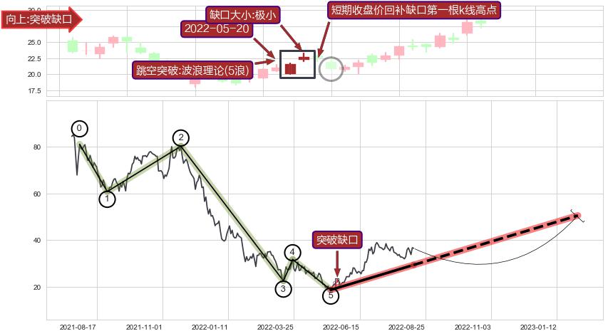 ➢ 突破缺口形成后,后续k已经超过14根,跳空突破波浪理论(5浪)关键点后, 出现【完全回踩】迹象,短期收盘价回补缺口第一根k线低点