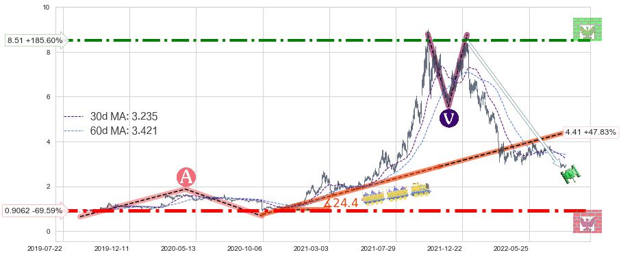 ♘ 支撑价格位0.9062,可信任强度95.62%,距离最后交易2022-08-12形成的收盘价格2.980相差 -69.59%