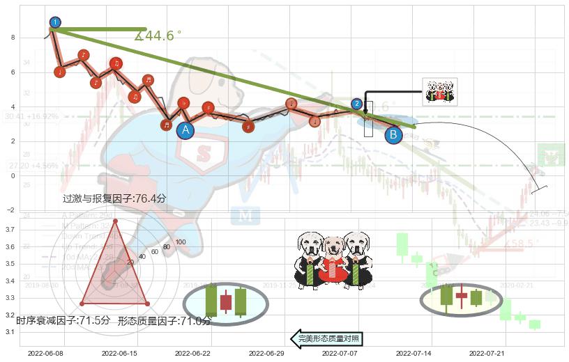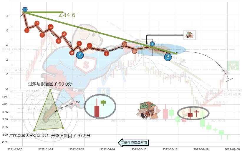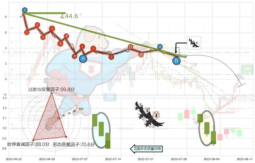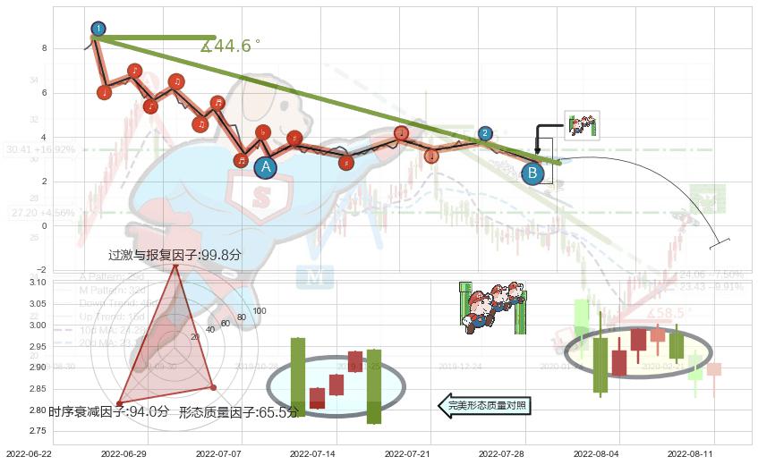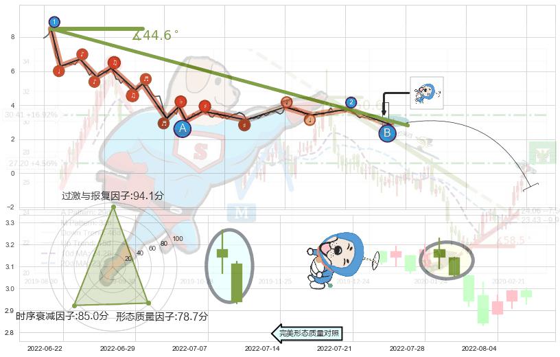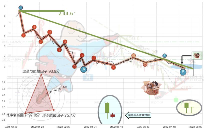 从2022-01-03至2022-08-11,共包含148个交易日,阶段股价下跌-95.12%,阶段股价变动位移路程比: 1 : 4,下跌趋势角度: 44.6