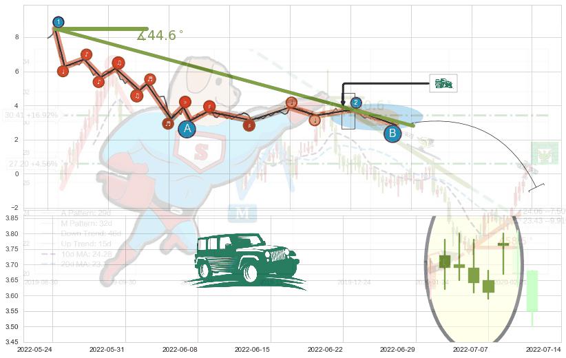 从2022-01-03至2022-05-24,共包含93个交易日,阶段股价下跌-76.48%,阶段股价变动位移路程比: 1 : 4,下跌趋势角度: 58.2