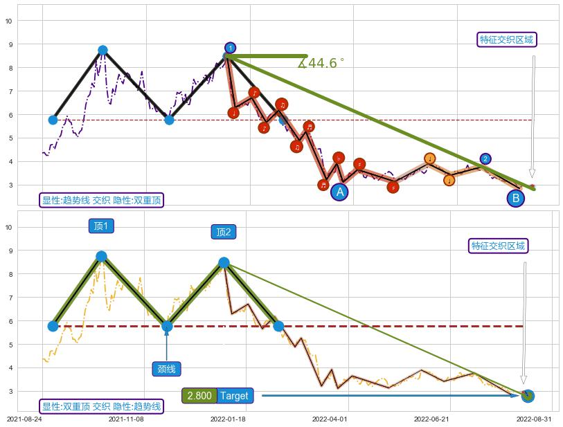 ➢ 双重顶:猜想预期下跌目标target即将达成,随后猜想强支撑来临,预期反弹上涨(均值回复)