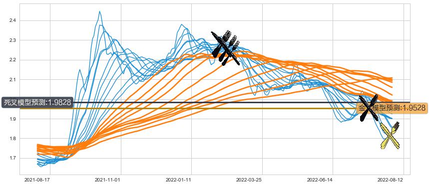 ➣ 21小时均线于(2022-07-20: 1.9562)形成【死叉】基于【死叉历史模型】预测死叉后最低波谷价格: 1.8744, 死叉后最低价格1.7700,已经下跌超出预测最低波谷价格, 预期反弹