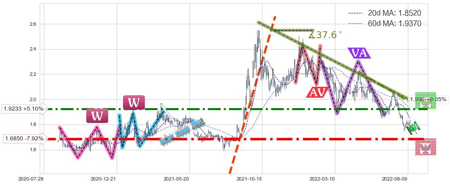 ♘ 支撑价格位1.6850,可信任强度97.83%,距离最后交易2022-08-12形成的收盘价格1.8300相差 -7.92%